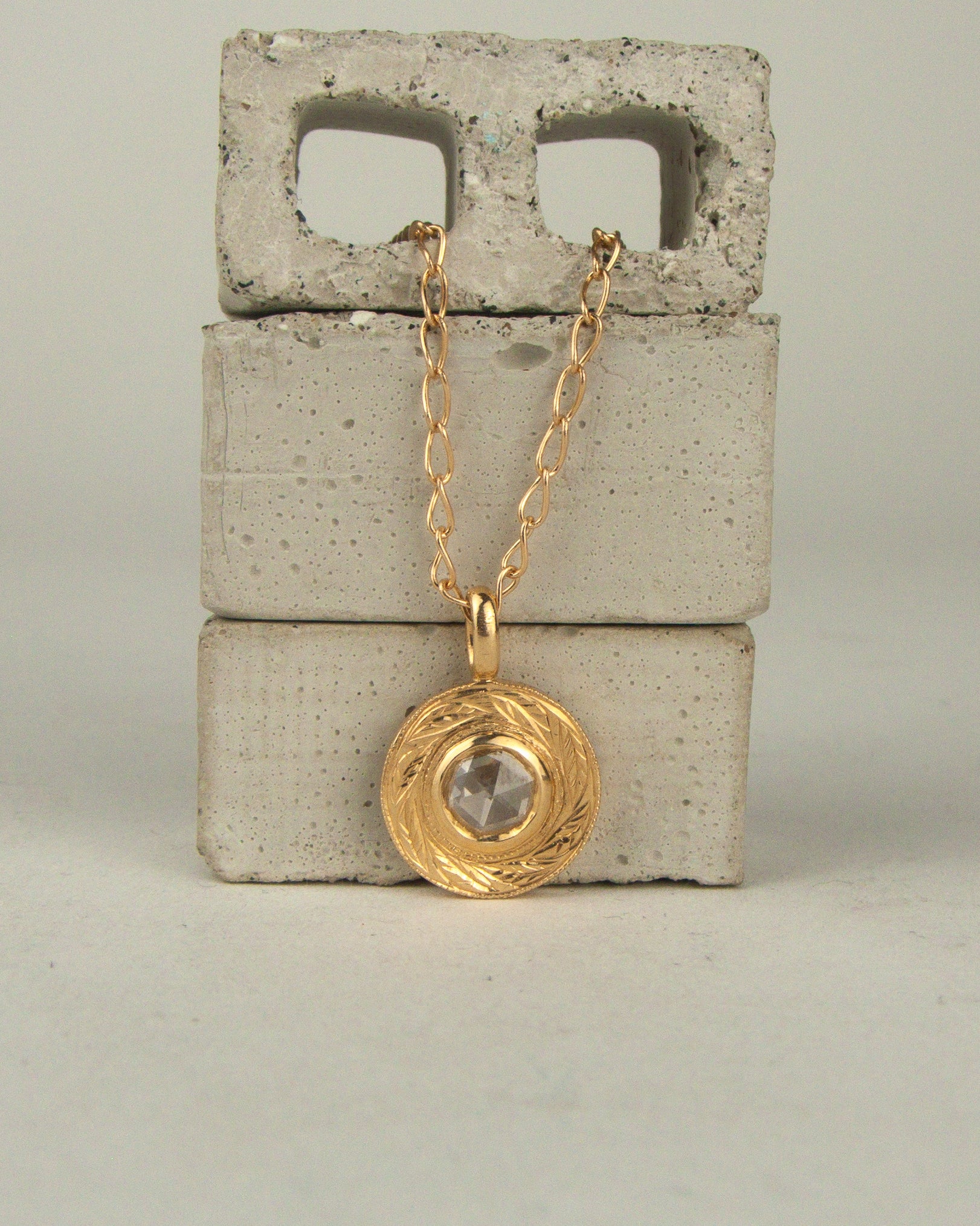 Intricately crafted from 14kt yellow gold, this pendant showcases a stunning .35ct rose cut diamond. Delicate leaves or swirling vines, meticulously hand-engraved, gracefully flow around the center diamond, adding a touch of natural elegance to the design.